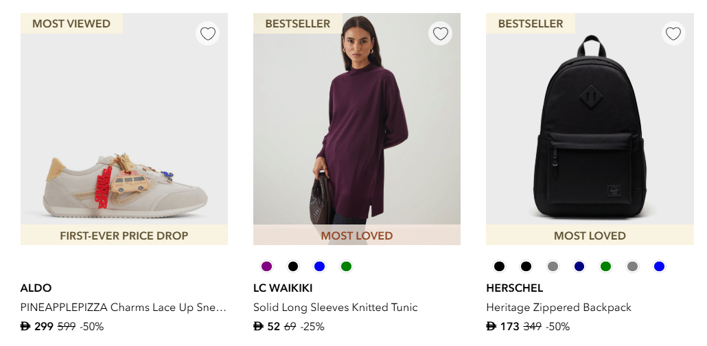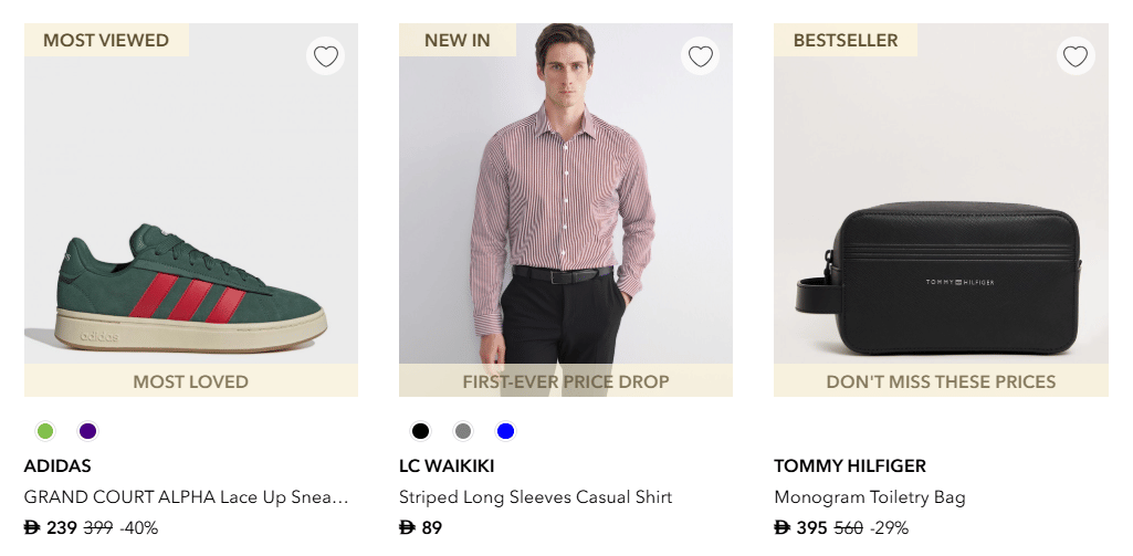 Top products—wallets, boots, tote bags, dresses, watches, jackets, heels, socks, abayas, belts, jeans, sandals, loafers, hoodies, white dresses, skirts, co-ord sets, laptop bags, sweaters, sports shoes, shirts, ballerinas, perfumes, sneakers, and more.