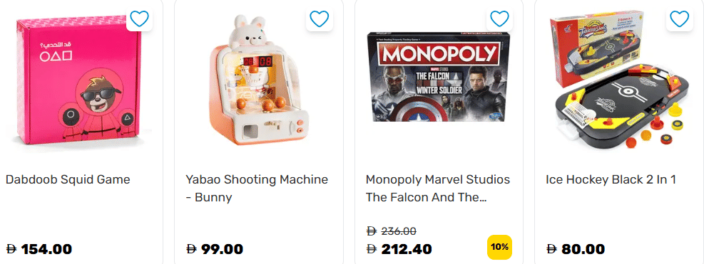 - Top products - Arabic board games, Monopoly, cards, Ice hockey, Word challenge, Ludo, Rubik's Cube, Chess, Connect four, Battleship, Jenga, Pictionary, Twister, Dart board.