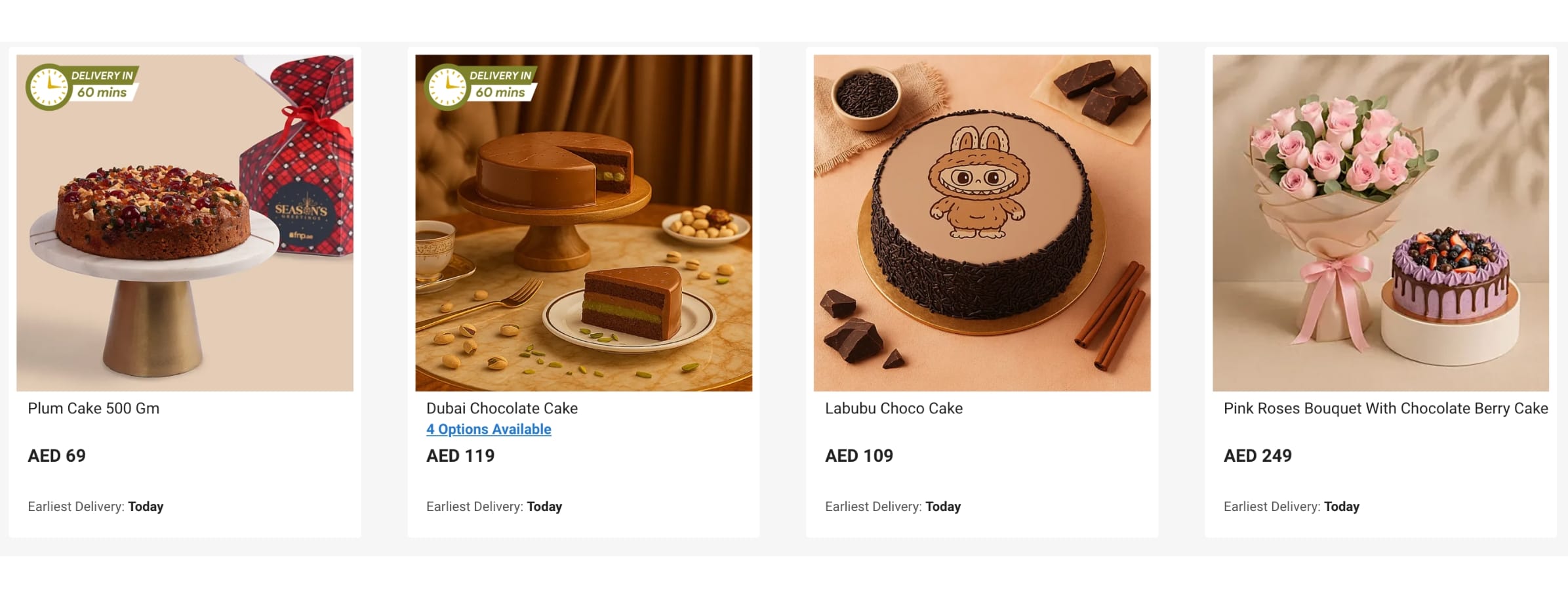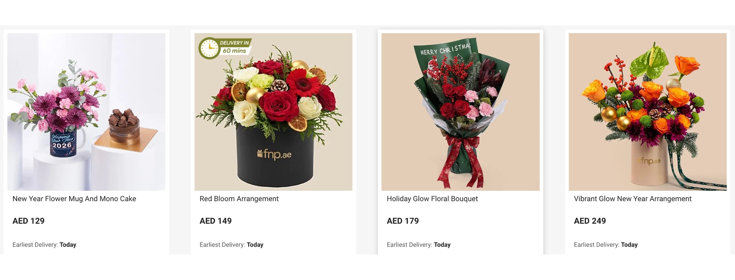 Fresh bouquets curated by professional florists remain FnP’s signature category. From roses to mixed arrangements, flowers are available for same-day and midnight delivery in many locations. Sale prices often begin around AED 79.
