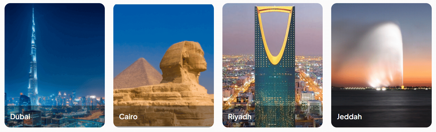 Popular destinations: Cairo, Riyadh, Jeddah, Madinah, Makkah, Dubai, and more.
