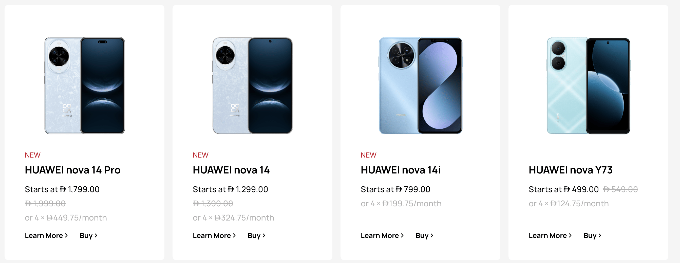 - Huawei smartphones include the Mate Series, P Series, and Nova Series, with prices starting from AED 599.