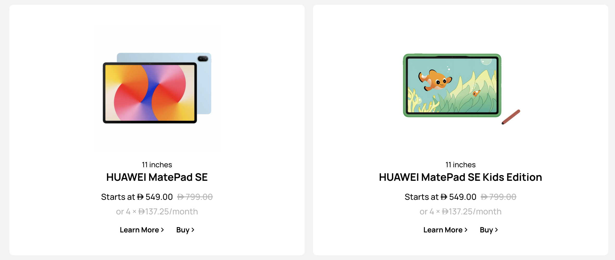 - Huawei tablets include MatePad Pro, MatePad Air, and MatePad SE, starting from AED 999.
