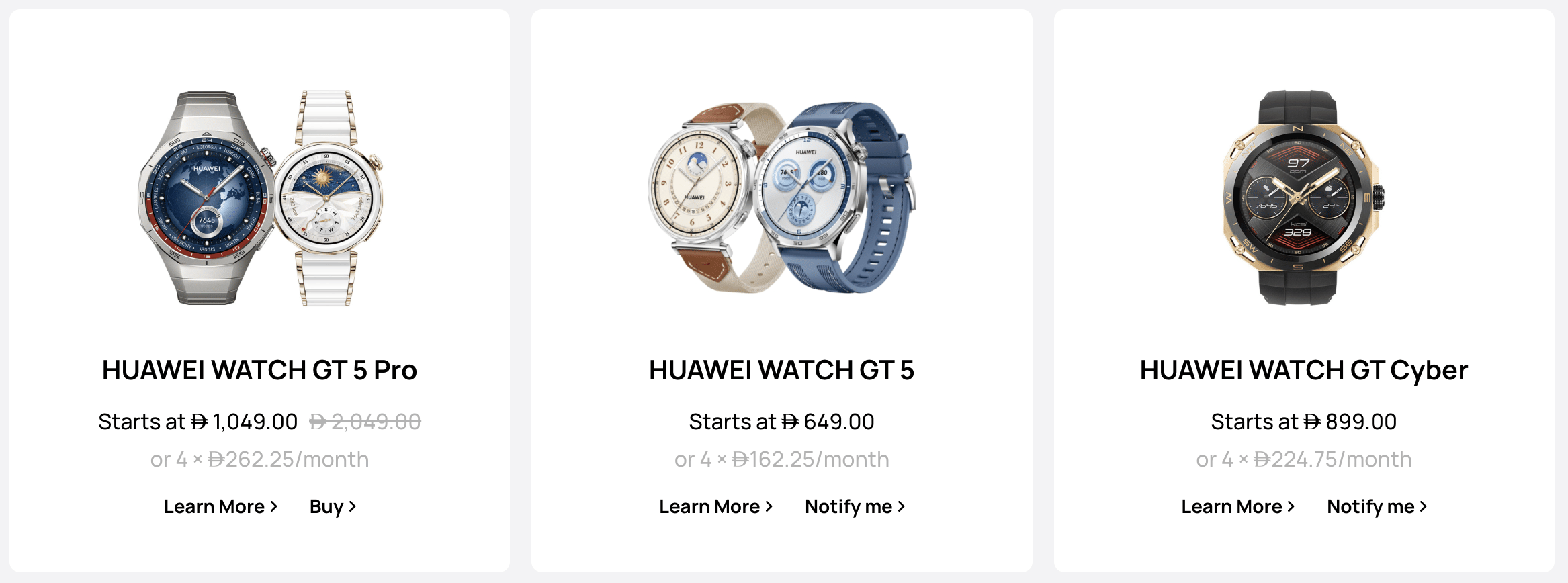 - Huawei wearables include WATCH Series, GT Series, and Health Series, starting from AED 479.
