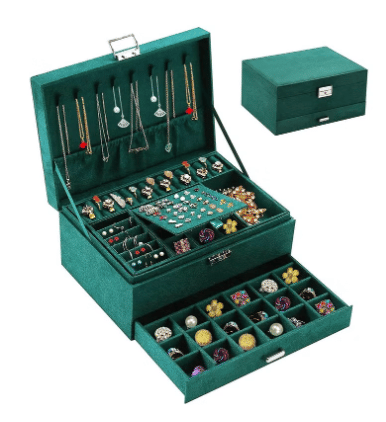 LARGE CAPACITY: 3-tier portable jewellery box with 8 necklace hooks + 1 large jewellery organizer + 36 earring organizer + 30 earring holder box + 17 ring holder box + 27 ring organizer box + 1 large bracelet watch box + 6 removable watch bracelet organizer box. |