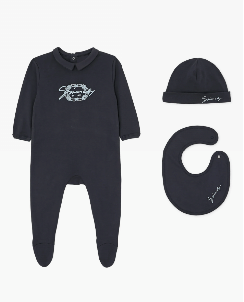 ![]() | Details Price - AED 1,450 Discounted Price - AED 870 Color - Navy Set includes - Onesie, Hat, Bib Material - Cotton Fit - Regular fit |