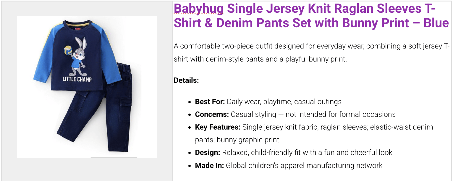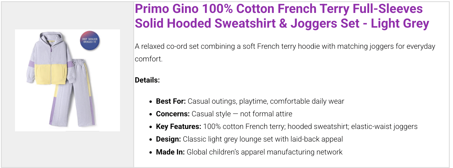 Co-ord sets reduce outfit planning and usually cost less than buying pieces separately. Parents tend to add these once the coupon brings the price down.