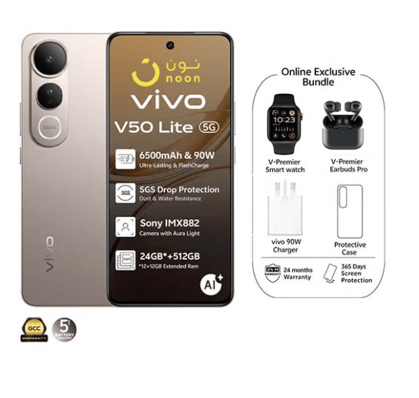 | v50 lite AI 5G (Titanium Gold, 12GB RAM, 512GB) A powerful 5G smartphone with large storage and bundled extras — great value for high performance. Details: