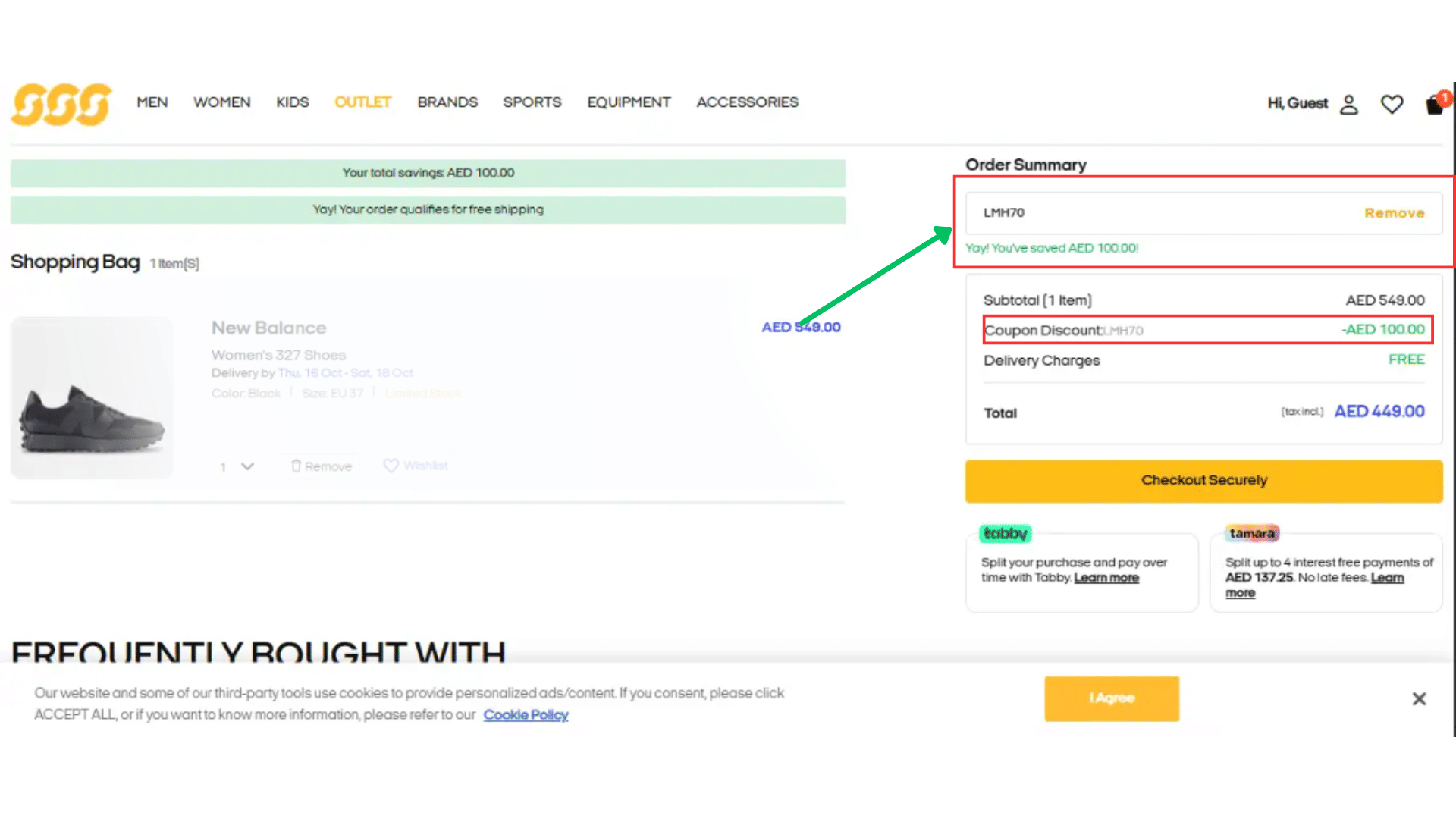 To use this coupon, visit Zoutons.ae, direct to the Sun and Sand Sports coupons page then copy the Sun and Sand Sports coupon code LMH73 available under coupons, and continue to the sunandsandsports.com website. Select your favourite sportswear, add them to your cart on the checkout page, under promo code section Enter/Paste the code into the box to unlock your discount instantly.Coupon Summary