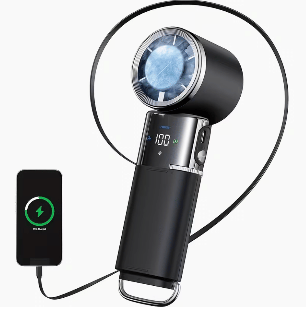 | Compact Ultrasonic Cooling Fan A portable battery-powered fan built for strong airflow indoors and outdoors. Details: