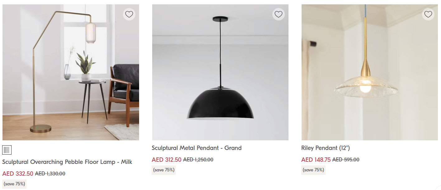 - Top Products: Sphere & Stem Chandelier, Staggered Glass Floor Lamp, and Mid-Century Task Table Lamps.