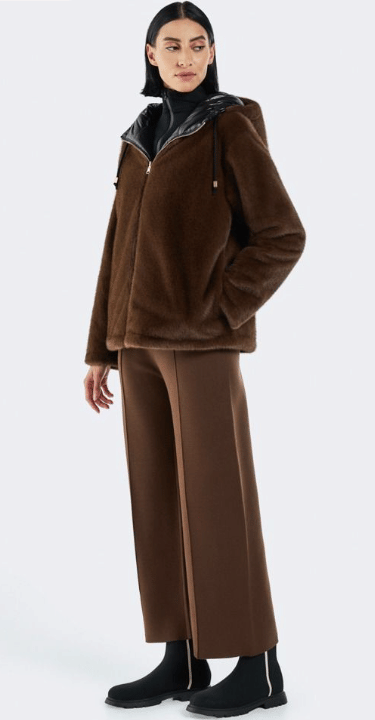 ![]() | Details Price - AED 530 Discounted Price - AED 370 Color - Brown Closure—Front zipper Material—Faux Fur Neckline - Hooded |