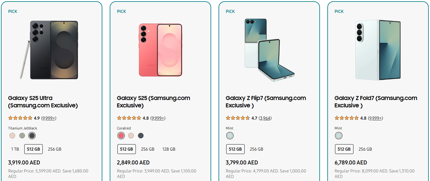 - Top Products: Galaxy S25 Ultra, S24 FE, Z Flip6, Z Fold7