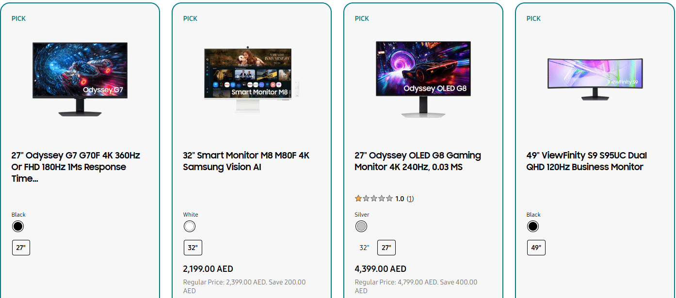 - Top Products: Odyssey OLED G8, Smart Monitor M8, View Finity