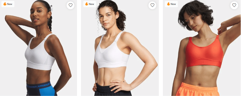 - Top Products: UA Infinity High Sports Bra, UA Crossback Mid Sports Bra, and UA Seamless Low Long Sports Bra.